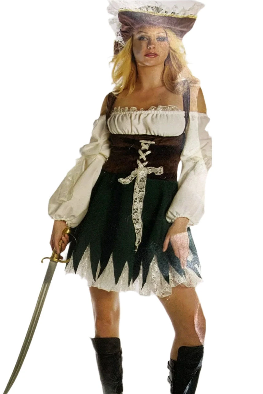 Get ready to command attention in the Cabin Lass, a lace front mini dress with an attached petticoat for added flair. Detached sleeve ribbons add a playful touch. (Sword, hat, wig, and boots not included – get creative!) Take charge in style with this versatile dress.