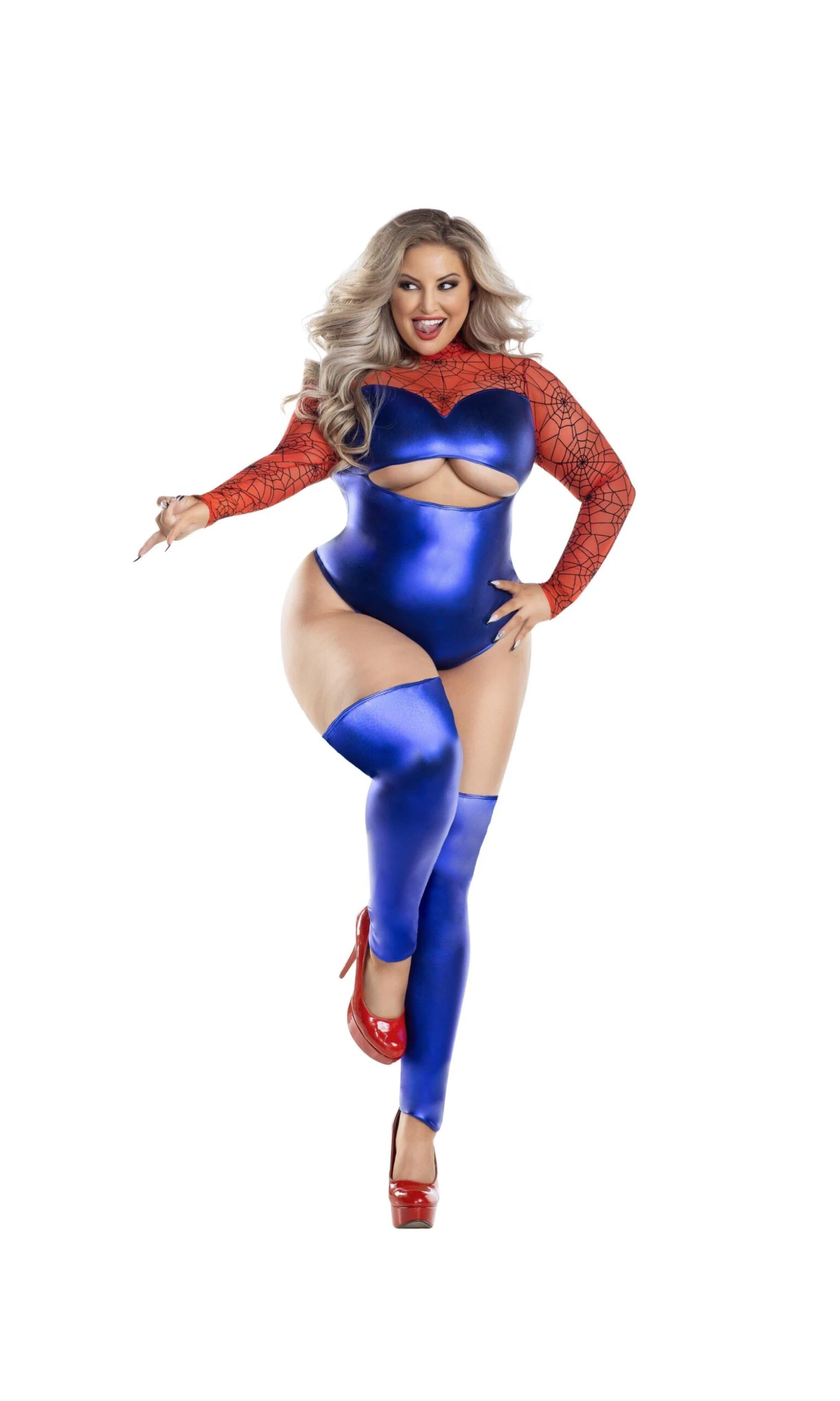 This plus size, Spiderweb Hero costume includes a blue lamΓ© bodysuit with under chest cut-out, red spiderweb mesh panels, and matching leg warmers.