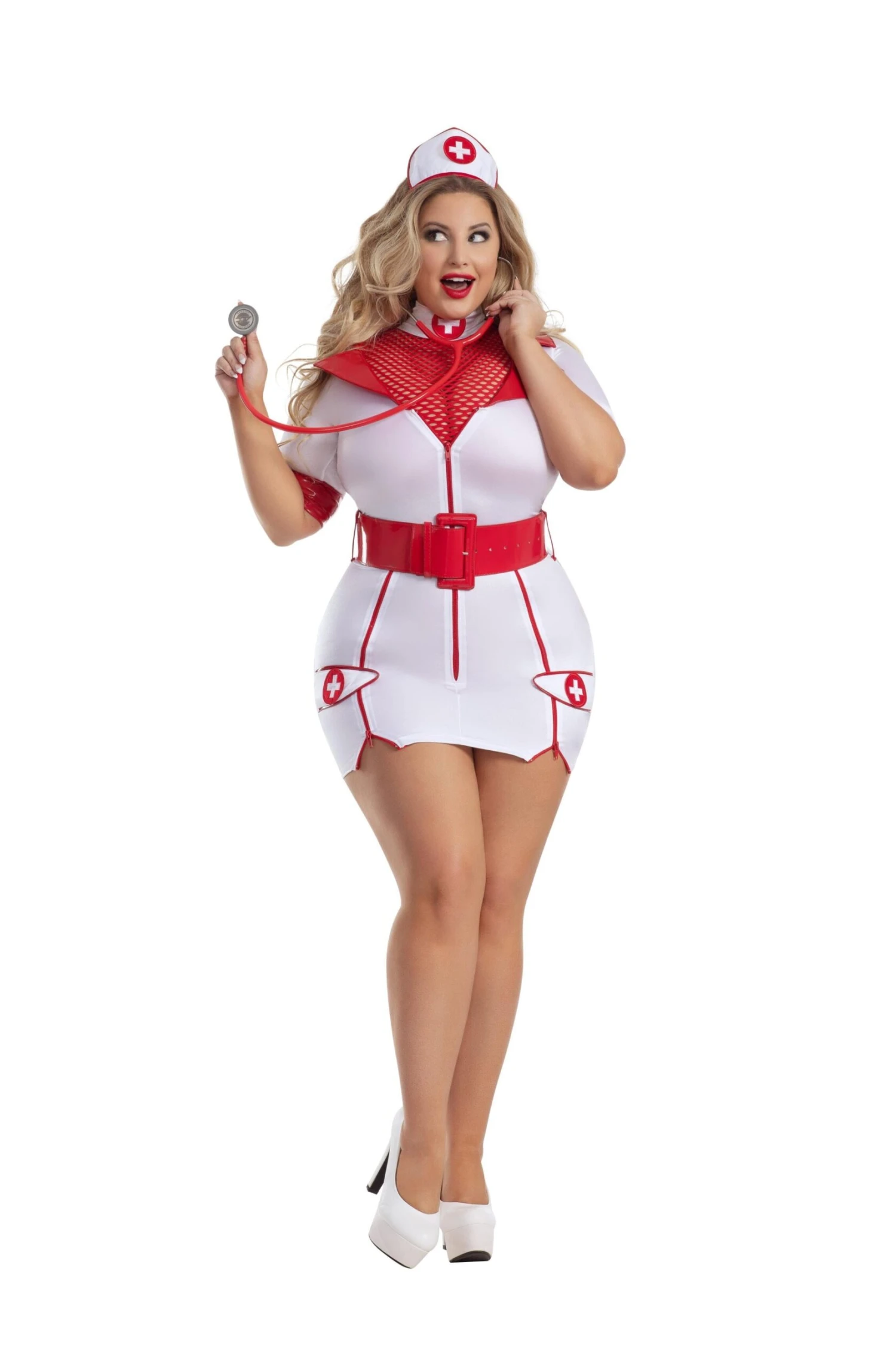 This plus Zip-Up Nurse costume features a white dress with a zip up front, red mesh bust, mini front slits, nurse patches, a high cut neckline and a nurse hat. (Stethoscope not included.)