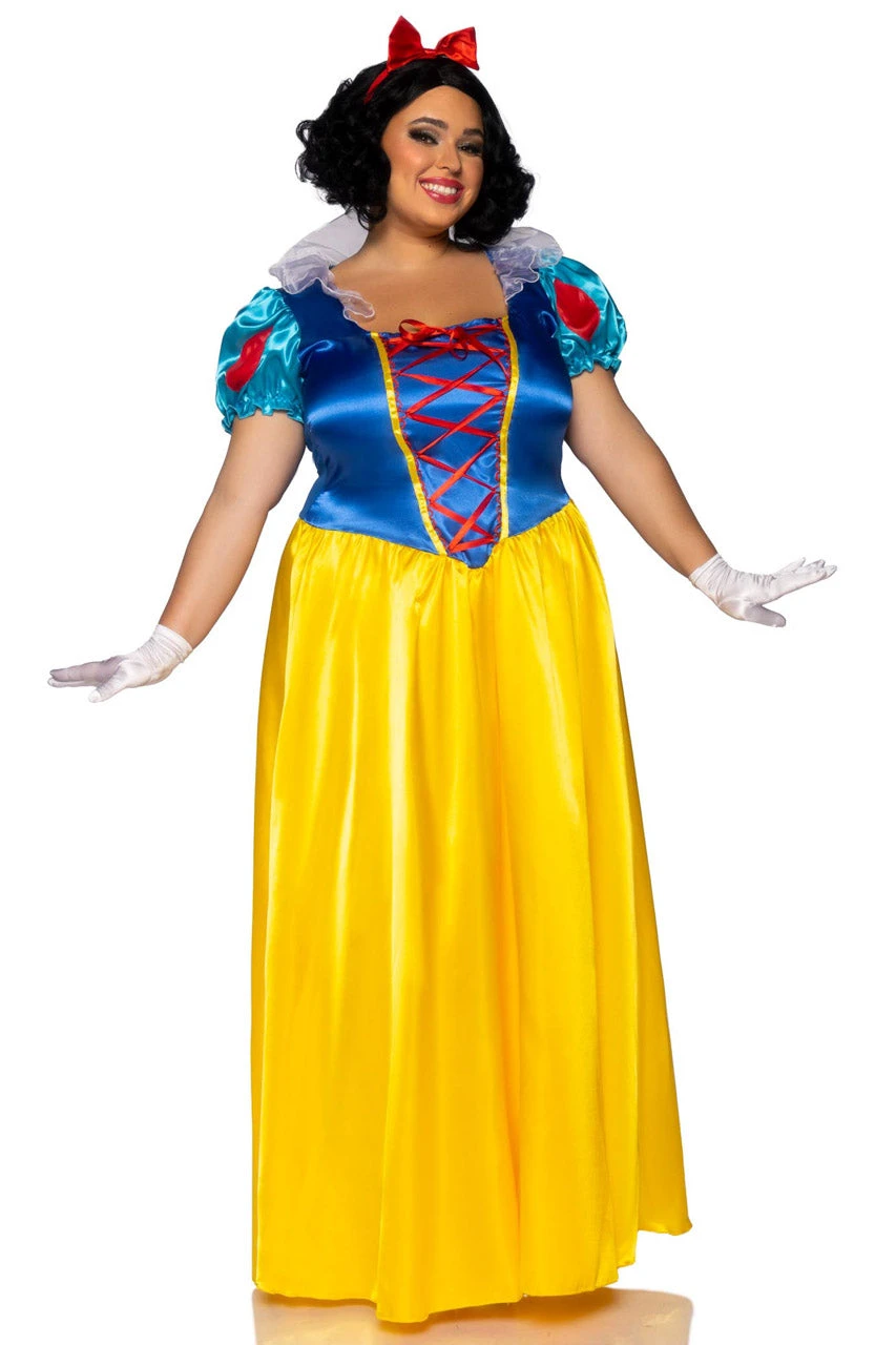 This two-piece, plus size, Classic Snow costume includes a long, blue and yellow satin dress with a faux lace-up bust, puff sleeves, white mesh collar, and red bow headband. (Gloves not included.)