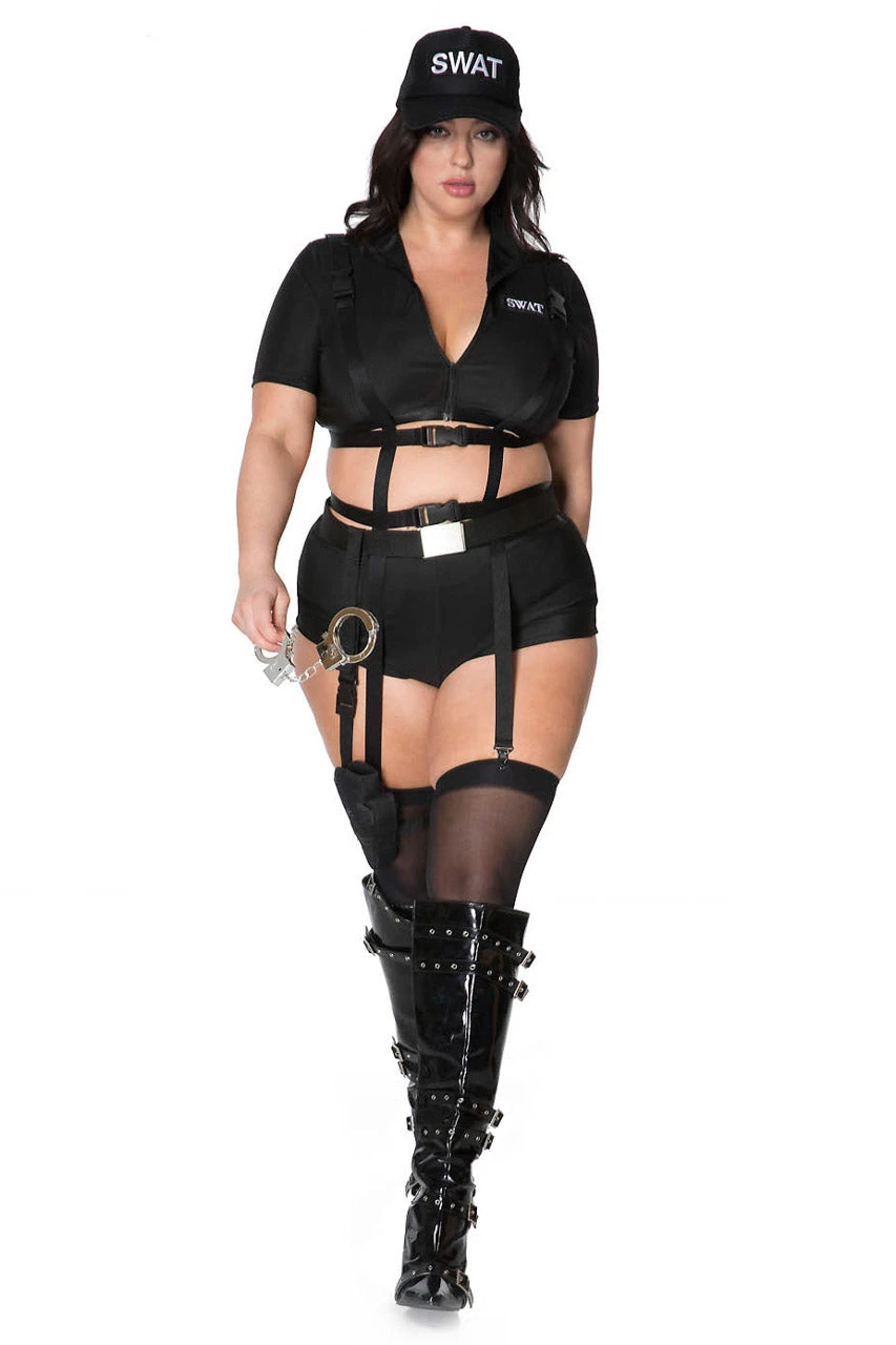 This seven-piece, plus size SWAT Commander costume includes a zip up collar crop top with badge accents, shorts, SWAT hat, body harness with front buckles and attached garter straps,belt,belt holster, cuffs.