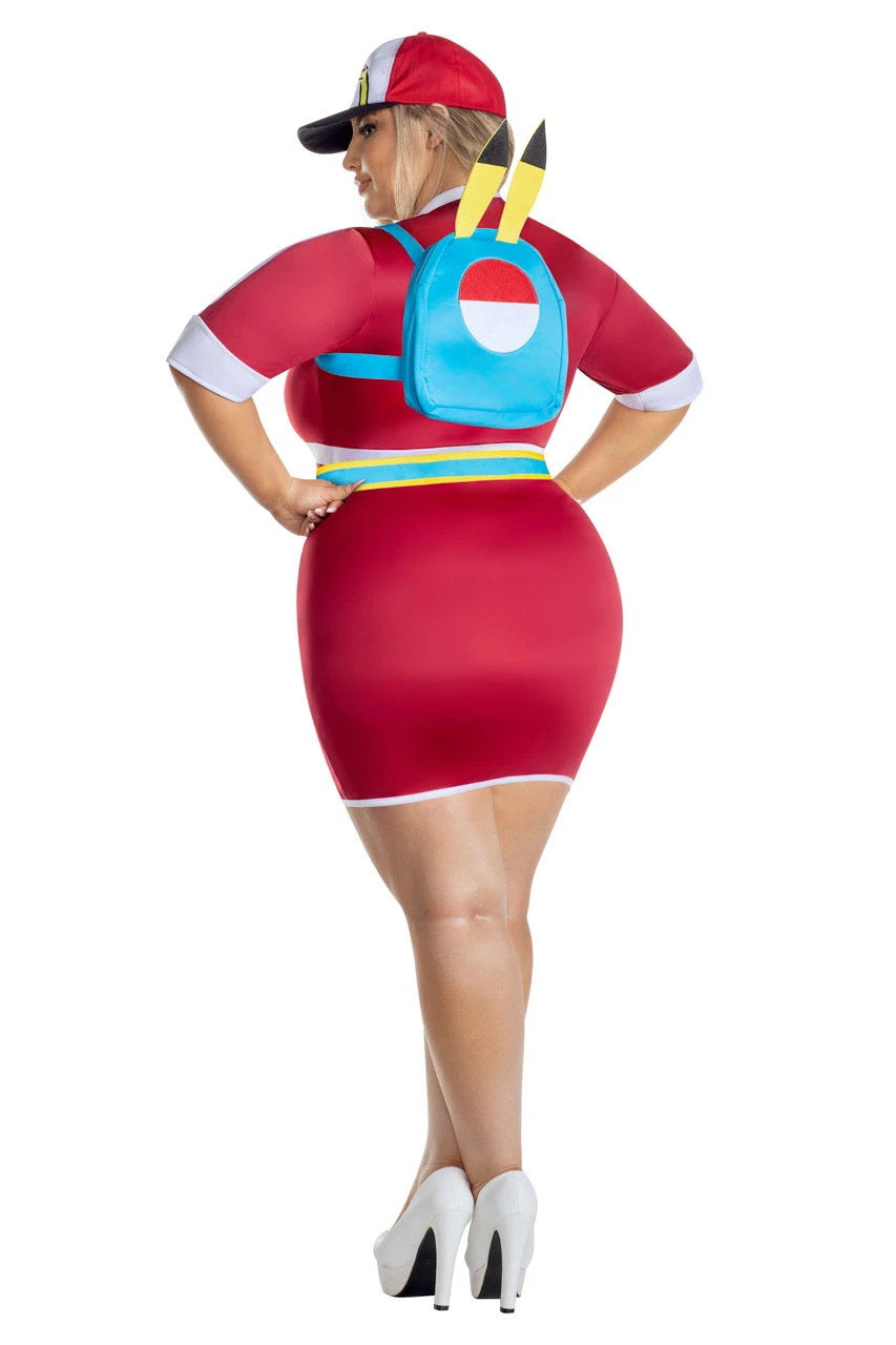 Catch ’em all in this plus size Beast Trainer costume featuring a red mini dress with white and blue trim detail, character backpack, and hat.