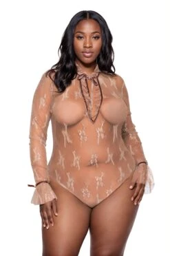 This plus size, elegant sheer nude and lace, long sleeve teddy features a high cut ruffle neck, a low cut bust with ruffle trim, ruffle cuffs, a cheeky cut back and a snap crotch closure.