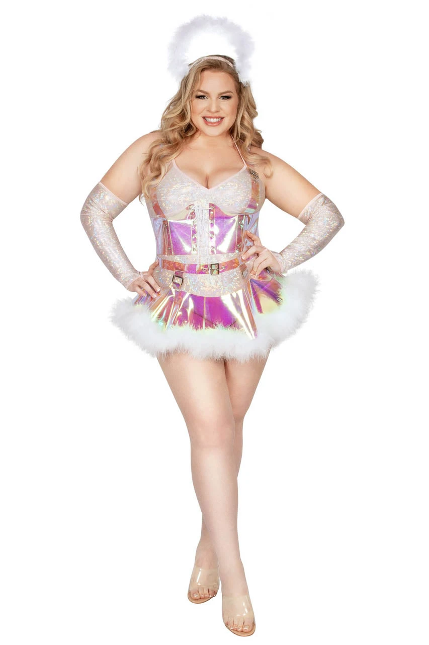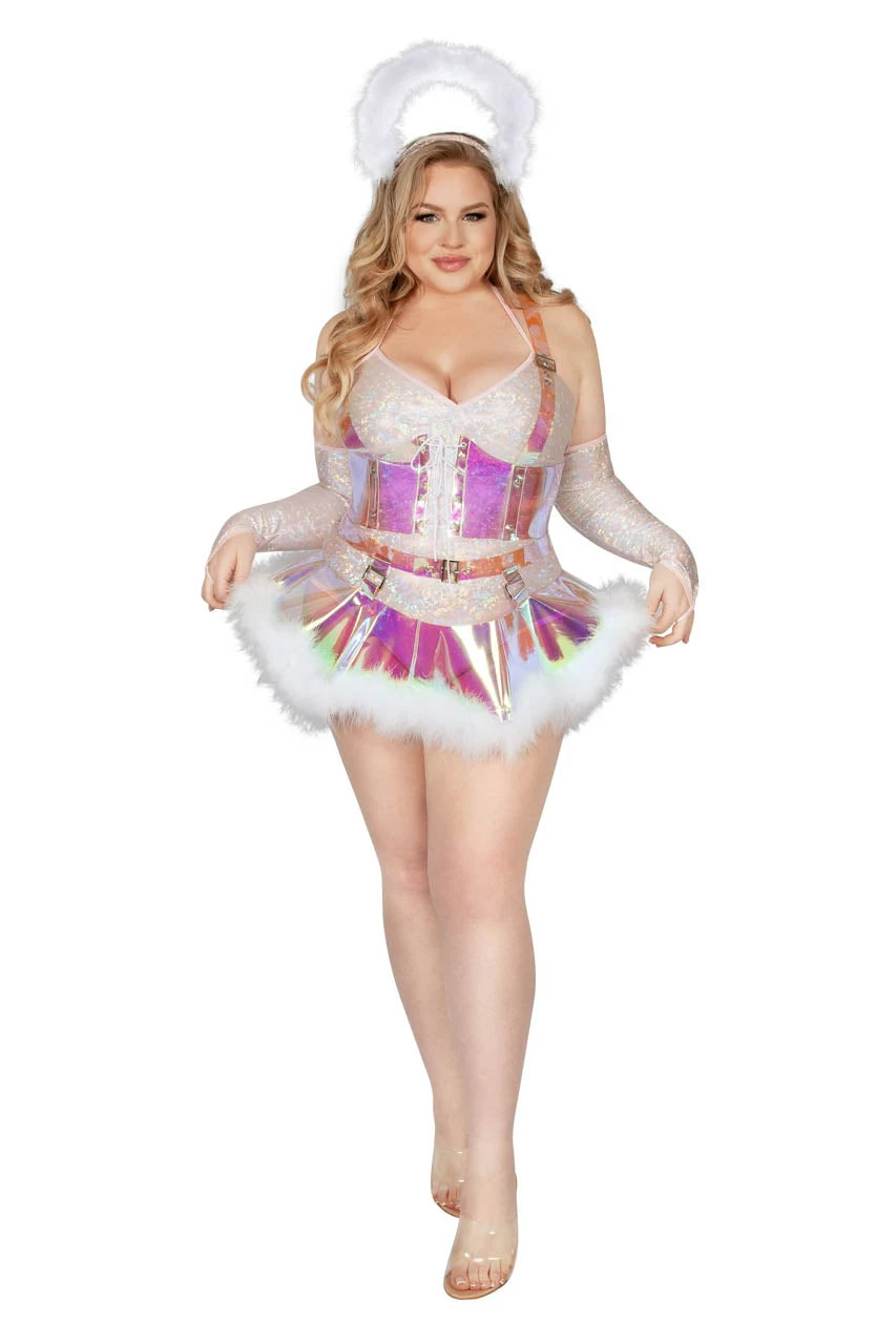 This plus size, Rave Angel costume includes an iridescent pink halter romper with pink iridescent plastic vinyl details, silver hardware, a lace-up corset, buckle skirt, a matching headpiece with white marabou trim and gloves.