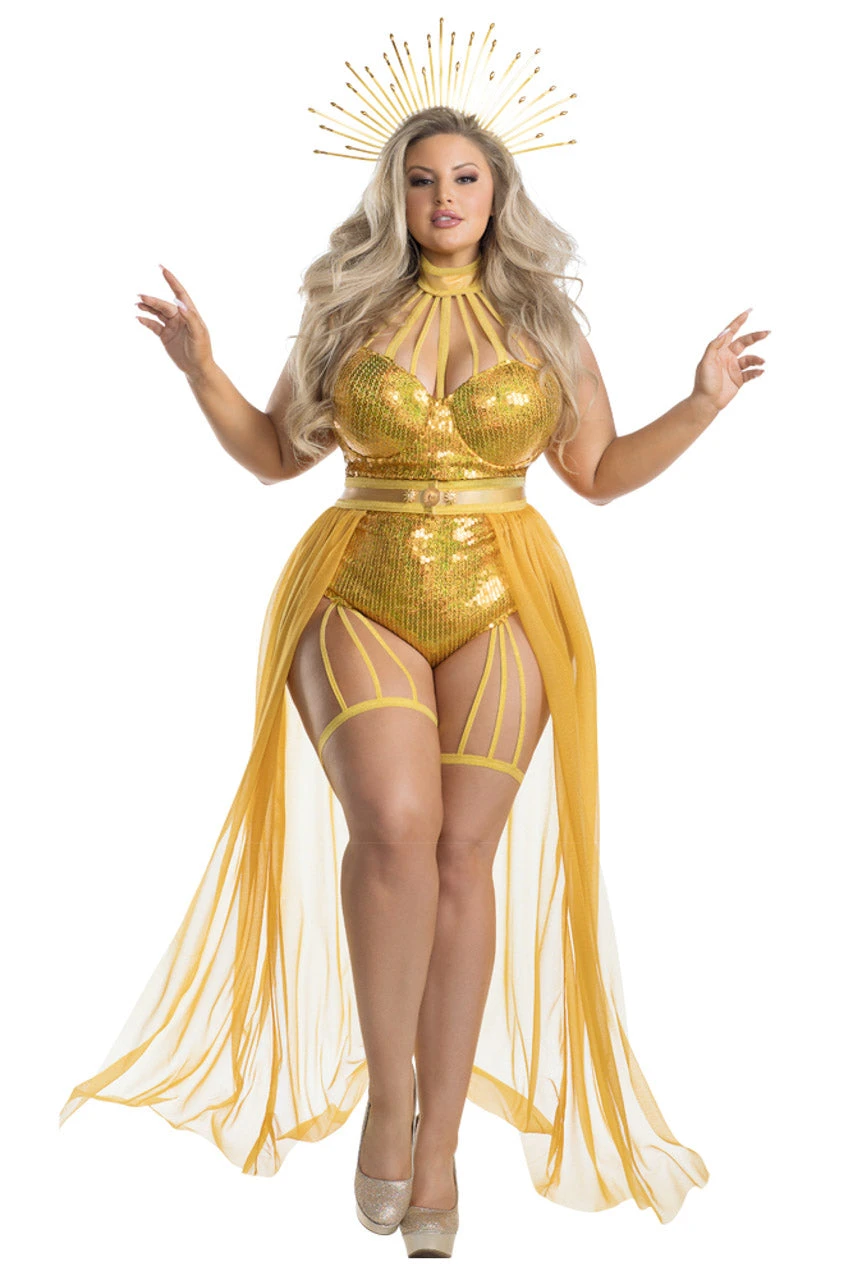 This plus size Rising Sun Beauty costume includes a gold sequin teddy with a strappy bust, attached leg garters, a gold lame’ belt with attached flowy skirt, and a gold sunburst headpiece.