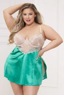 This two-piece, plus size touch of glamour babydoll features a satin skirted bottom, an ivory lace top with underwire cups, side slits, gold hardware, a hook and eye back with open detail, and a matching g-string.