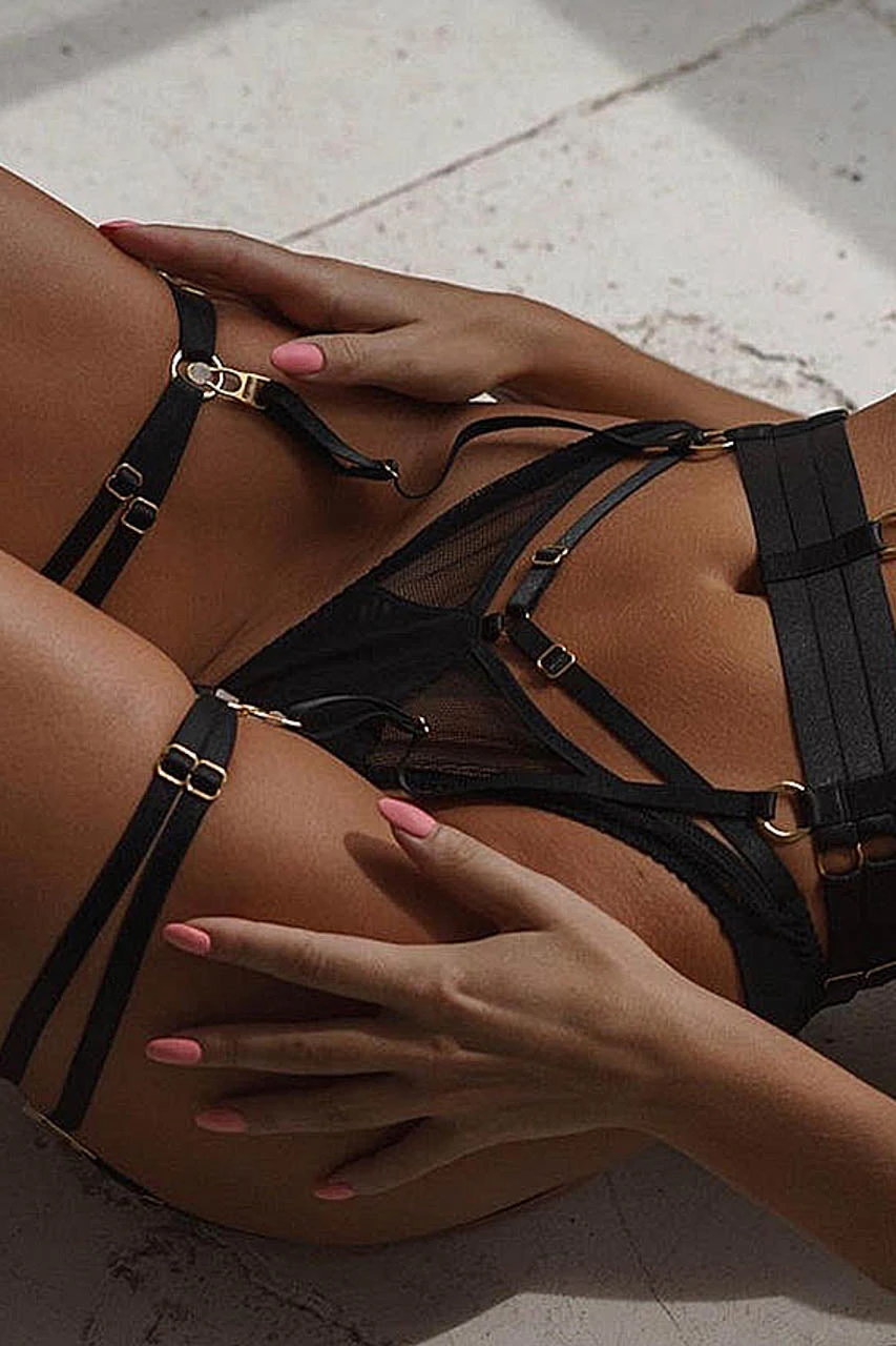 This sexy, plus size set includes a black banded bra with mesh insets, underwire cups, adjustable straps, a matching thong, and a strappy, high-waisted garter belt with leg garters.